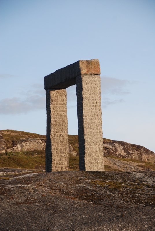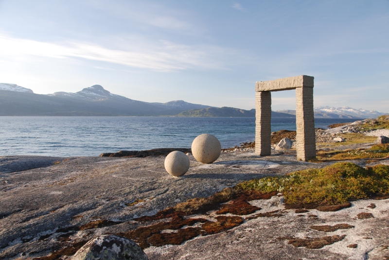on the rocks overlooking the sculpture, the landscape, the fjord, whilst